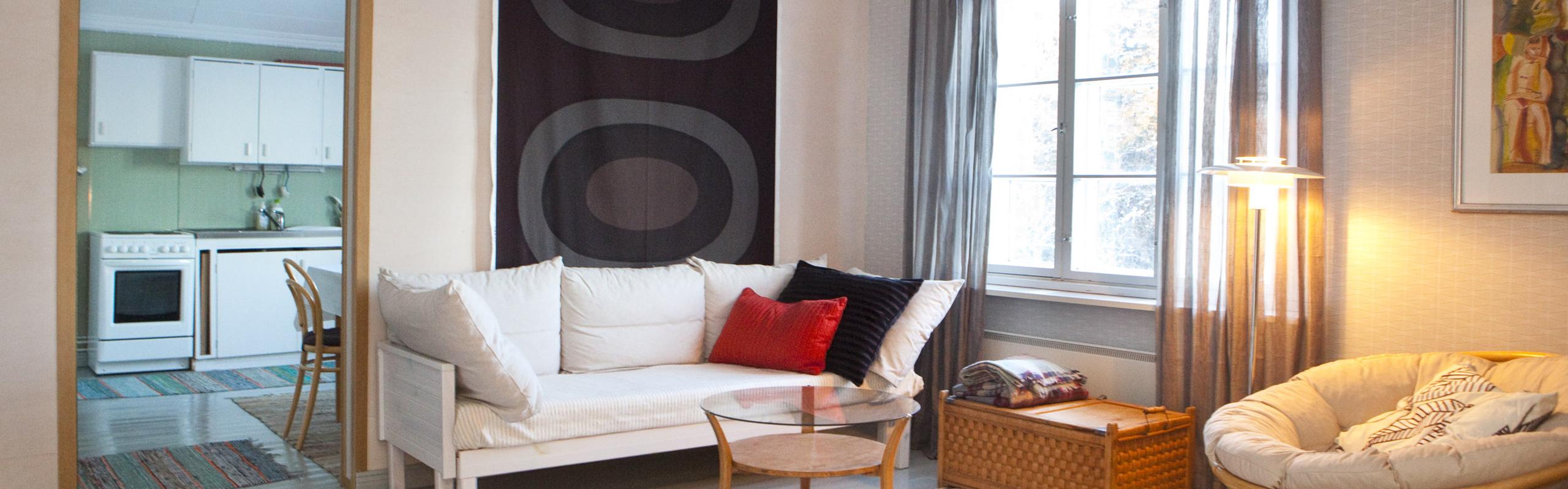 The teacher's studio upstairs is a generous 50 square meters, with a living room, sleeping alcove, kitchen, toilet, and shower. The studio is ideal for two people, but it can accommodate three if necessary.