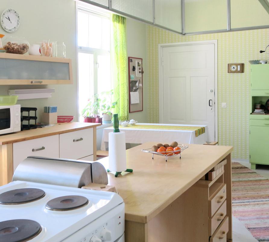 The teacher's studio upstairs is a generous 50 square meters, with a living room, sleeping alcove, kitchen, toilet, and shower. The studio is ideal for two people, but it can accommodate three if necessary.